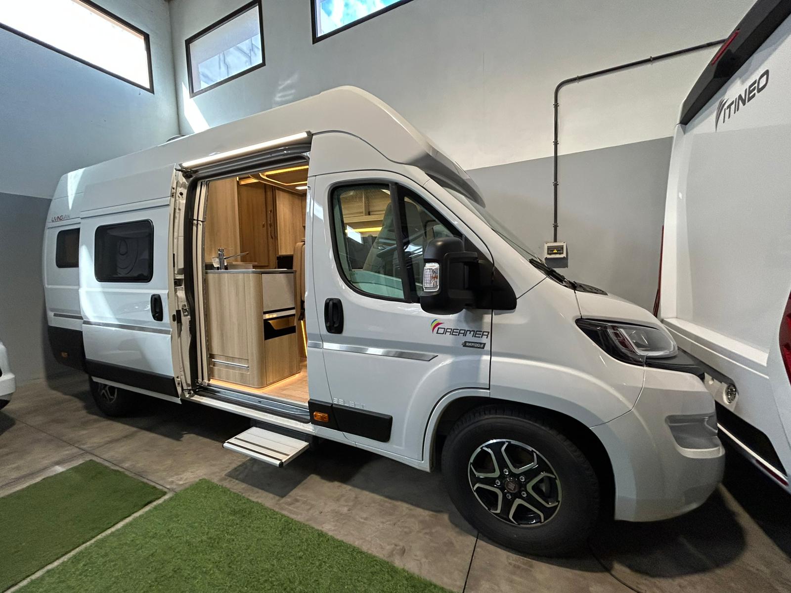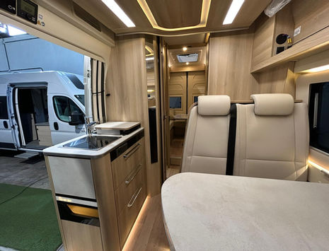 Una distribución original y muuuuy cómoda para los que priorizan la habitabilidad y familia, pero manteniendo el tamaño de una camper. Con un gran doble salón convertible en cama, y con una cama doble basculante que baja al salón.