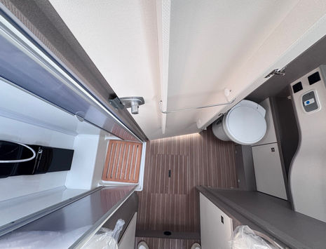 Cama escamoteable sobre la cabina (196 x 150 cm), ideal para dos adultos, sin ocupar espacio en la zona de día cuando no se usa.Baño con ducha y WC separados